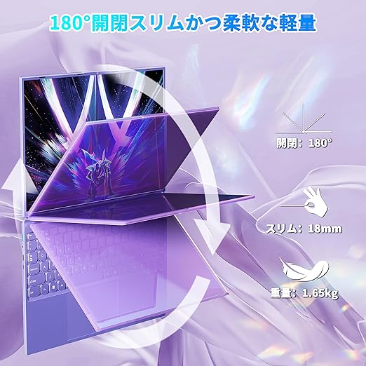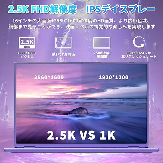 ノートパソコン【MS Office 2019/Win 11Pro】16インチ2.5K FHD(2560x1600) IPS 高速静音CPU Celeron N5095 2.0~2.9Ghz/メモリ:DDR4 16GB Webカメラ/USB 3.0*2/mini-HDMI/SSD拡張 Webカメラ付き/指紋認証/7色のバックライト付きキーボード マウス付き (高速SSD:16+512,パープル)… `