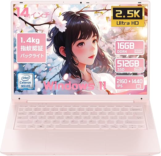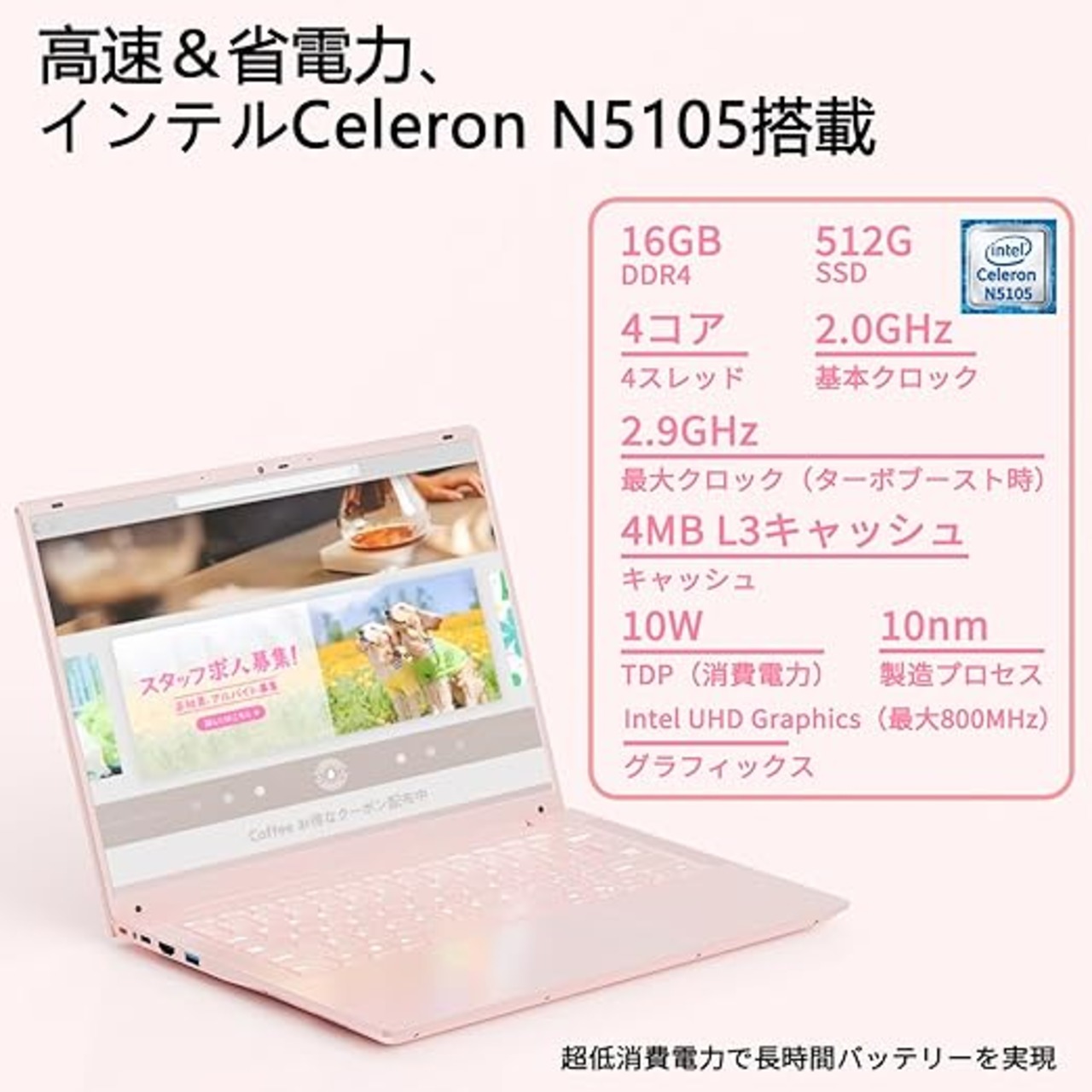 BINTEC ノートパソコン薄型軽量14インチ2160*1440 IPSディスプレイ/第11世代 Celeron N5105搭?/6000mAh 大容量バッテリー/1.4kg/16GBメモリ/Windows 11対応MS Office 2019搭載/WiFi 5 /BT 5.0/Type-C/マウス付き/コスパノートPC軽量デザイン(サクラピンク, 512G SSD) a