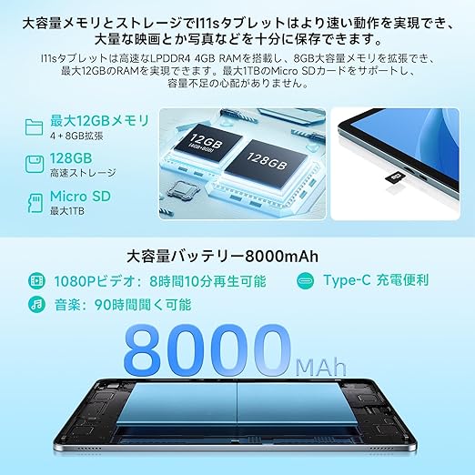 【Android15 タブレット IPS大画面 TDDIタッチスクリーン】bmax タブレット I11S、タブレット 11インチ 8000mAh+WidevineL1 Netflix対応、アンドロイド15 タブレット 8コアCPU T606 12GB+128GB+1TB拡張、タブレット 10インチ以上 wi-fiモデル、Type-C充電+GMS+GPS+顔認識+BT5.0+OTG+5G WIFI a | PCBASE