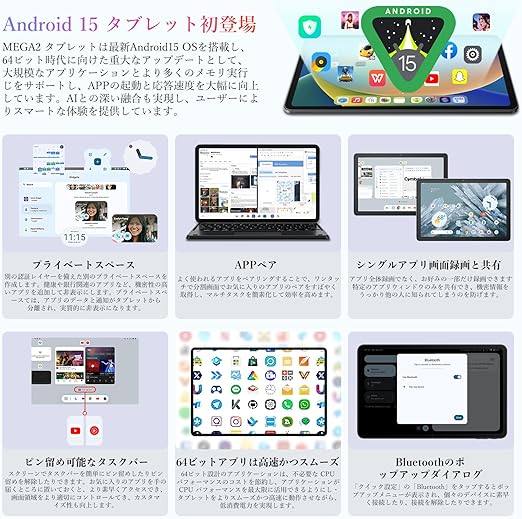 【Android 15 タブレット12インチ 、専用保護ケース付き、タッチペン付き】Blackview MEGA2 タブレット androidは最新Android15 OSを搭載し、64ビットAPPアプリケーションに深く最適化され、起動と応答速度が向上しています。 また、弊社の二次開発では、システムUIの一部が改善・最適化され、より多くのサードパーティ製アプリケーションに適応し、システムインタラクションがよりフレンドリーで便利になりました。プライベートスペース:機密性の高いアプリやデータを見えな