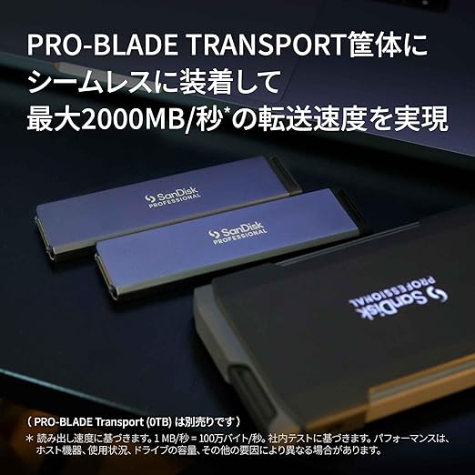 【交換可能なモジュラータイプ!「PRO-BLADE TRANSPORT」搭載用SSD】本商品は、ポータブルなモジュラータイプのSSDです。専用のSSDケース「PRO-BLADE TRANSPORT」に搭載してお使いください。最大4TBの大容量にもかかわらず、コンパクトサイズで軽量なので、持ち運んでの使用にも適しています。最大2,000MB/秒の高速データ転送(※1)&優れた耐衝撃性を兼ね備え、映像撮影や編集などプロの現場にも最適です。※1 「PRO-BLADE TRANSPORT」(別売り)搭載