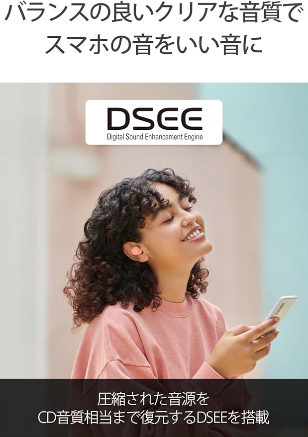 高音質かつ自分好みに調整可能 高音域から低音域までバランスが良好で、かつボーカルが自然で明瞭 DSEEで圧縮された音源をCD音質相当まで補完し、自分好みの音質に調整も可能