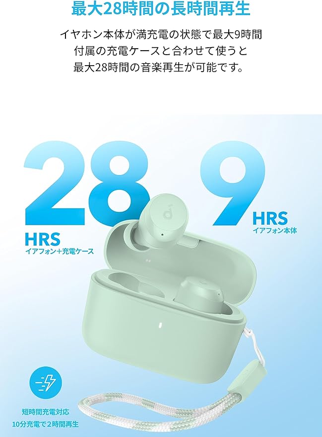 最大28時間長時間再生:イヤホン本体が満充電の状態で最大9時間、付属の充電ケースを合わせて使うと、最大28時間の音楽再生が可能です。また10分間の充電で約2時間分の音楽再生が可能です。