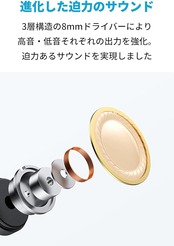 進化した迫力のサウンド:前モデルからサイズアップした3層構造の8mmドライバーにより 高音・低音それぞれの出力を強化。 迫力あるサ