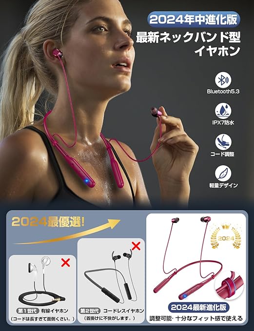 【2024新設計ネックバンド型・長さ調整・Bluetooth 5.3】Bluetooth イヤホン ネックバンド型 首掛けイヤホン 40時間再生 ブルートゥースイヤホン CVC8.0ノイズキャンセリング Type-C急速充電 スポーツ イヤフォン マグネット搭載 自動ペアリング ハンズフリー通話 IPX7防水 軽量 音量調節 Siri対応 技適認証済 日本語説明書付き(赤) a | PCBASE