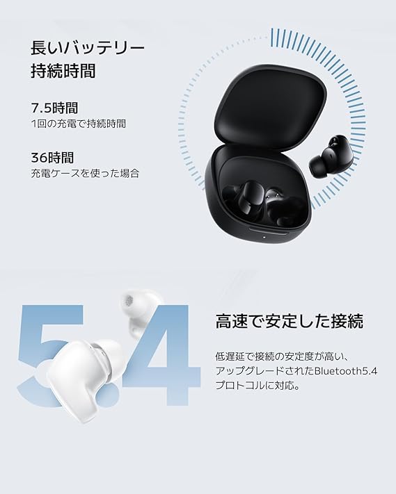 【最大36時間の再生時間】イヤホン単体で1回の充電で最大7.5時間、充電ケースを使用すれば最大36時間の再生を持続。昼も夜も良質な音楽を楽しめます。そして、10分間の充電で最大3時間再生が可能となる急速充電も搭載。