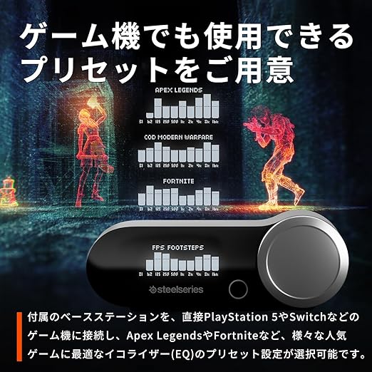【ゲーム機でも使用できるプリセットをご用意】Sonarが使用できないPS5やSwitchでも、GameDAC Gen2(ベースステーション)本体にApex LegengsやFornite等、様々なゲーム(現在14タイトル)に最適なプリセットが選択可能。SteelSeriesのヘッドセットをご使用いただく事で、より最適なサウンド設定を体感いただけます。