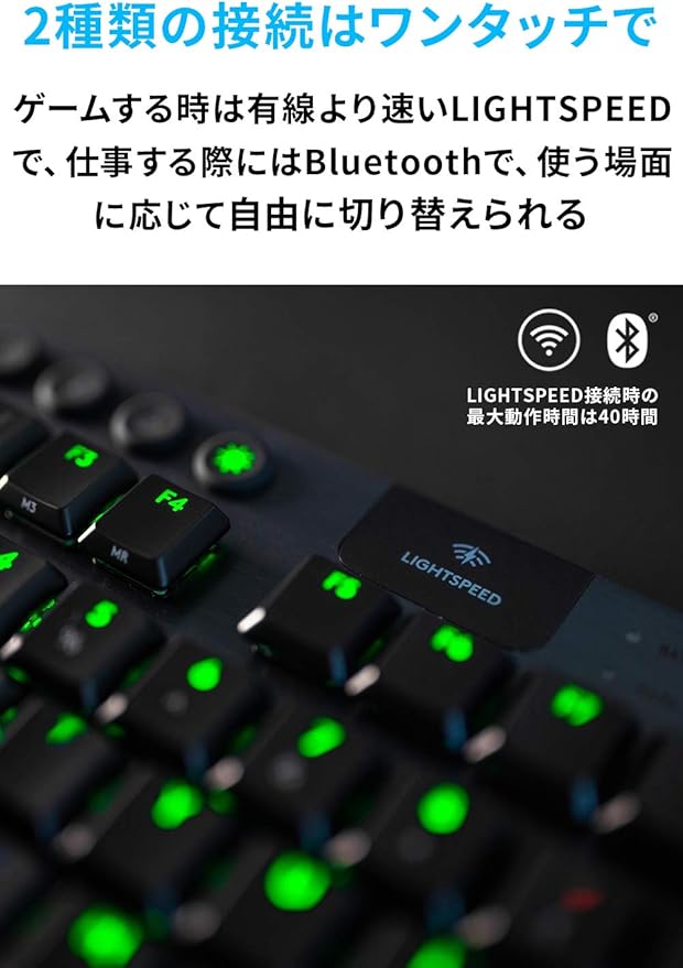 【有線より速いLIGHTSPEED】LIGHTSPEED ワイヤレス テクノロジーを搭載、無線遅延の無いワイヤレスゲーミングキーボード。Bluetooth接続にも対応でデバイス2台と同時接続が可能。