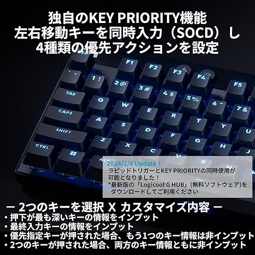 ロジクールG独自の「KEY PRIORITY」テクノロジー/左右移動キーの同時入力(SOSD)に優先アクションを指定/