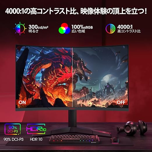 [WQHD&4000:1コントラスト比]27E6QCA 27インチ ゲーミングモニターは、2560 x 1440p画質により最高な映像体験を提供します。該当27インチモニターは4000*1優れるコントラスト比まで達し、鮮やか色と繊細な映像を実現し、HDR10機能も搭載しており、ゲームも映画も存分に楽しめます。