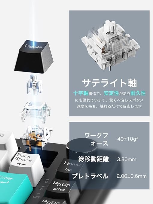 【日本語配列とカナ印字一体 メカニカルキーボード】JIS規格に準拠した標準日本語配列を採用し、かな印字がキーに直接施されたメカニカルキーボードです。日本のユーザー向けに特別設計され、日常的な日本語入力やタイピングに最適です。日本語環境に対応し、使いやすさと快適さを両立させたキーボードです。