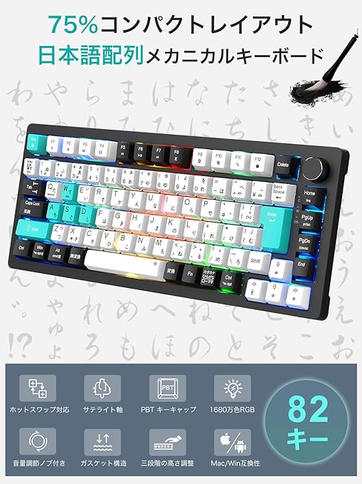 メカニカルキーボード KB820【2025年業界オリジナル開発・日本語配列とカナ印字一体】75% ガスケットゲーミングキーボード 有線 着脱式 カスタマイズキーボード USB C/A両用 82キー PBTキーキャップ 押下圧 40G ノブ付き LEDバックライトMac/Windows対応 サテライト軸 a | PCBASE