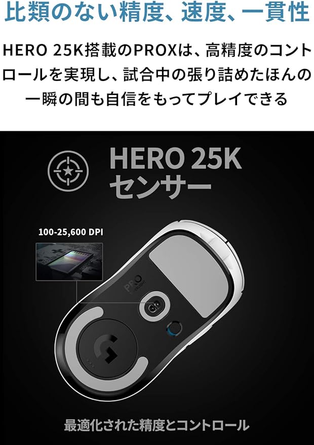 【HERO 25Kセンサー搭載、70時間連続プレイ可能】3年間にわたる独自開発、400IPS・100-25,000DPIの精度は従来品の約4倍、電源効率も約10倍向上。満充電時の最大バッテリー持ちは70時間。(GPROは60時間)