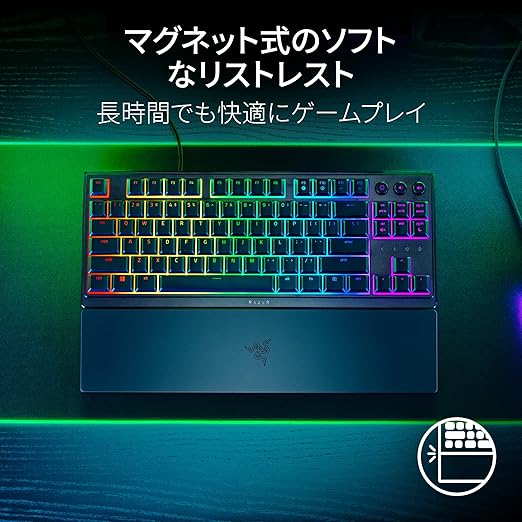 Razer レイザー Ornata V3 Tenkeyless JP 心地良いクリック感のメカ・メンブレンスイッチ搭載テンキーレス薄型有線キーボード ロープロファイル バックライトが光る専用メディアキー UV コートキーキャップ Chroma RGB ライティング マグネット式リストレスト付属 日本語配列 【日本正規代理店保証品】オルナータ ブイスリー テンキーレス ジェイピー a | PCBASE