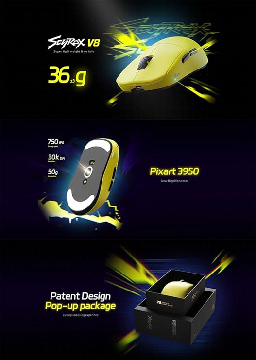 SCYROX(サイロックス) V8 2.4GHz ワイヤレス 両対応 8K対応 超軽量 36グラム 光学スイッチ Pixart 3950センサー 8000Hzポーリングレート 5ボタン ドングル同梱 高コスパ ソール付属ゲーミングマウス (Black)【正規国内品】 a | PCBASE
