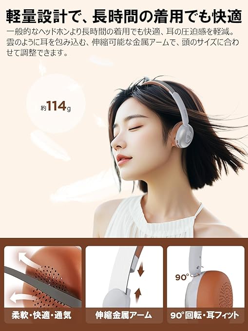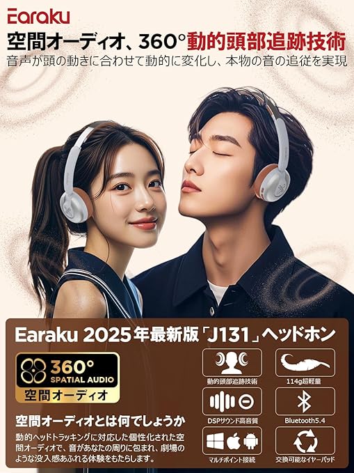 【空間オーディオ・ANCノイズキャンセリング】:本製品の日本市場における正規販売権はEarakuが所有しています。Earakuの高音質ワイヤレスヘッドホンは、40mmのダイナミックドライバーとハイレゾ音源対応で、クリアで繊細な音質を実現。革新的な技術によって、豊かな空間立体音響とともに、動的頭部追跡機能も搭載しています。この機能により、ヘッドフォンがユーザーの頭の動きに合わせて音場をリアルタイムで調整し、さらに没入感のある音楽体験を提供します。集中して作業や音楽を楽しみたい時には、空間オーディオ