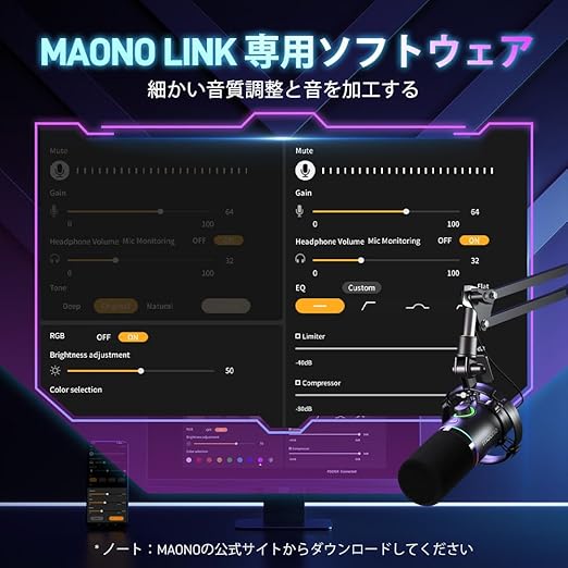 【独自の【MAONO LINK】ソフトウェアでサウンドの可能性を広げ】MAONO LINKソフトウェアにより、用途に合わせて最適なマイクセットアップが可能です。マイクの理想的なトーンの選択、RGBライトのカスタマイズだけでなく、過大な音を防ぐリミッター、音量を調整するコンプレッサー、4つのプリセットイコライザーなどアドバンス機能もサポートしています。本ソフトウェアの機能は、マイクのUSBモードのみに対応しています。