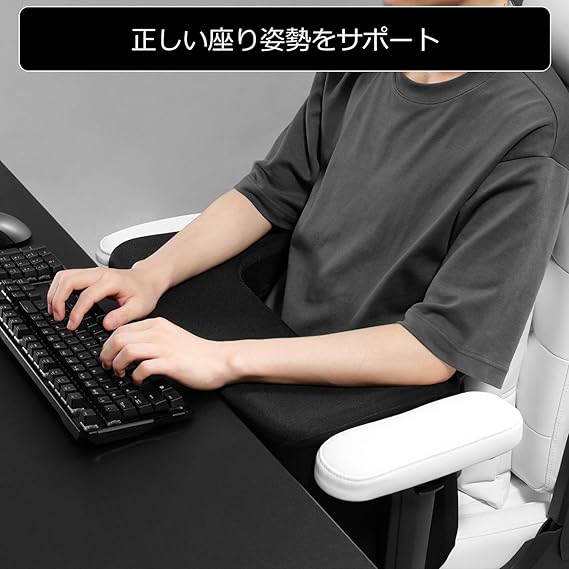 【ひざ上に腕置きスペースを増築】チェアからデスクまでの隙間を埋める、コの字形状の肘掛けクッションです。身体前面を囲うようにアームレスト化。あらゆる体格・プレイスタイルのPC操作をサポートします。
