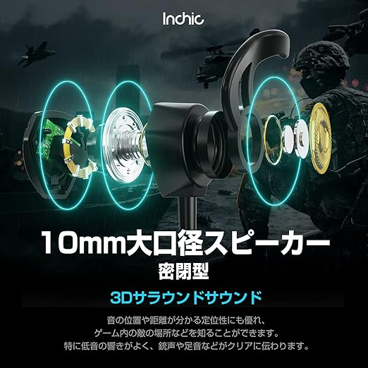 「ゲームに集中できるゲーミングイヤホン」inchicのゲーミングイヤホンは遮音性の高いカナル型を採用しており、周囲の音を気にせずにプレイに集中できます。普通のイヤホンと違い、10mmのドライバーを搭載しているため、音を細部まで聞き取りやすいです。音の位置や距離が分かる定位性にも優れ、ゲーム内の敵の場所などを知ることができます。特に低音の響きがよく、銃声や足音などがクリアに伝わります。