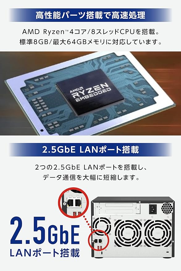 【高性能パーツ搭載で動作もスムーズ】CPUはAMD Ryzen クアッドコアプロセッサCPUを搭載。メモリも8GB搭載(増設で最大64GB)で安定通信を実現。