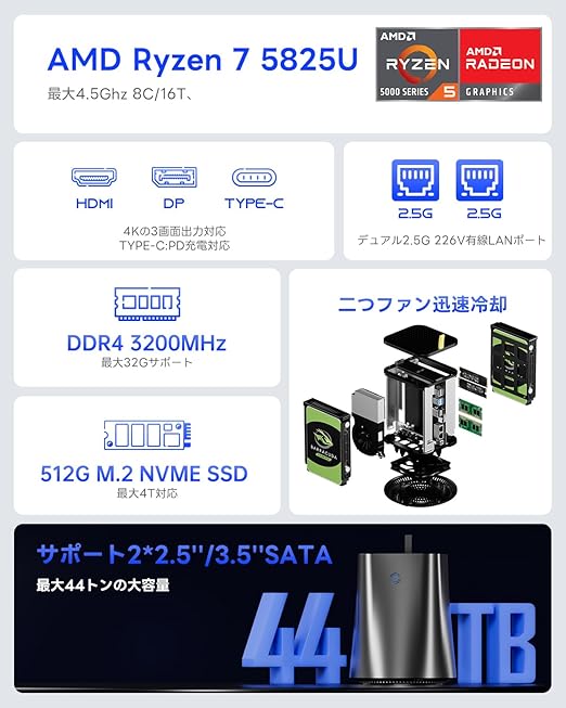 AOOSTAR ミニPC NAS 2べい Ryzen 7 5825u OSなし mini pc nasキット DDR4 二つM.2 SSDと40TB SATA HDD拡張可 静音 9cmファン 2.5GLANx2 WIFI6 BT5.2 3画面 4k対応 hddストレージ ソフトルーター ゲーミング パソコン 灰色 R7 a | PCBASE