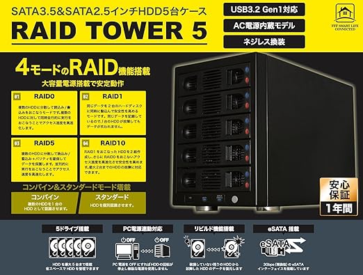■4つのRAID機能(RAID0、RAID1、RAID5、RAID10)に対応 本製品は、RAID機能を搭載した複数台HDDケースです。主な特長として、複数のHDDに分散 してデータを書き込み高速化。複数のHDDをまとめて1台にして大容量で使用。同じデータを 2台のHDDに同時に保存して安全性を高める機能が搭載されています。RAIDモード以外にも スタンダードモード(個別認識)とコンバインモード(複数台認識)も塔載されています。