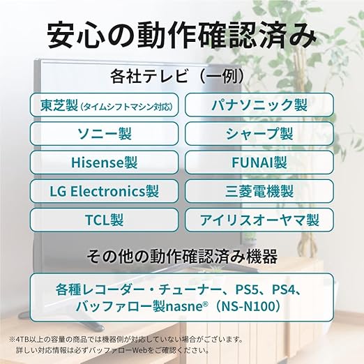 【対応TV】シャープ「アクオス」、ソニー「ブラビア」、パナソニック「ビエラ」、バッファロー「nasne」、Hisense、東芝「レグザ」、FUNAI、オリオン、三菱電機、LG Electronics、日立「Wooo」、ピクセラ、DXアンテナ、ディーオン(対応機種の詳細はメーカーHPを参照)