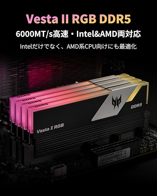 Acer Predator Vesta Ⅱ DDR5 6000MHz デスクトップPC用メモリ 32GB(16GB×2枚) RGB(発光型) シリーズ (PC5-48000) Intel XPM 3.0 準拠 AMD EXPOメモリキット ブラック BL.9BWWR.652 a | PCBASE