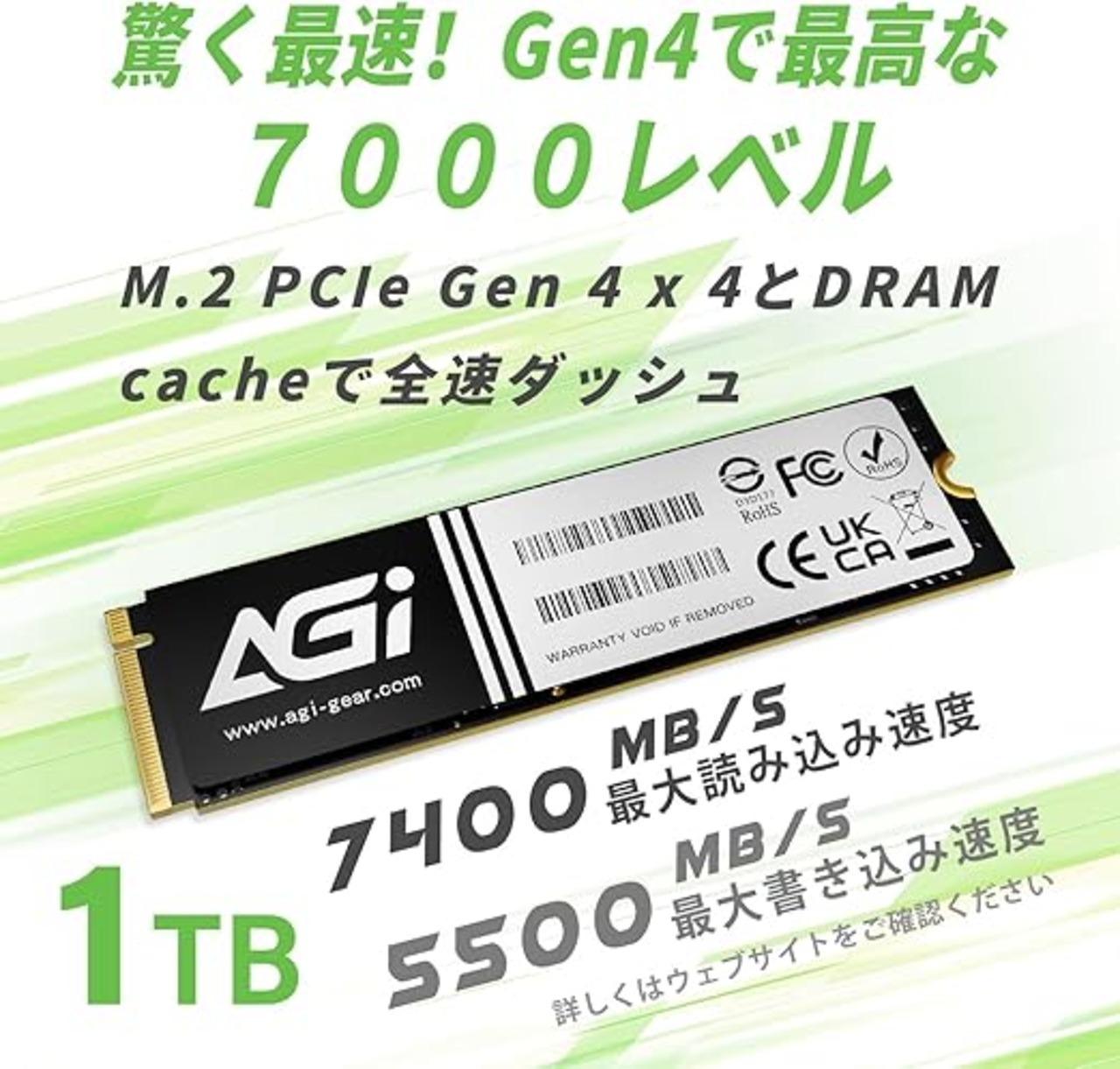 先進的なM.2 PCIE Gen4とDRAMのキャッシング技術の組み合わせにより、最大読み込み速度7400MB/秒、最大書き込み速度5500MB/秒の超高速データ転送を実現します。