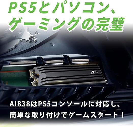 AGI AI838はPS5ゲーム機やパソコンに適しており、容量と速度を完全にアップグレードしたため、スムーズなゲームプレイや動画ストリーミングをお楽しみいただけます。