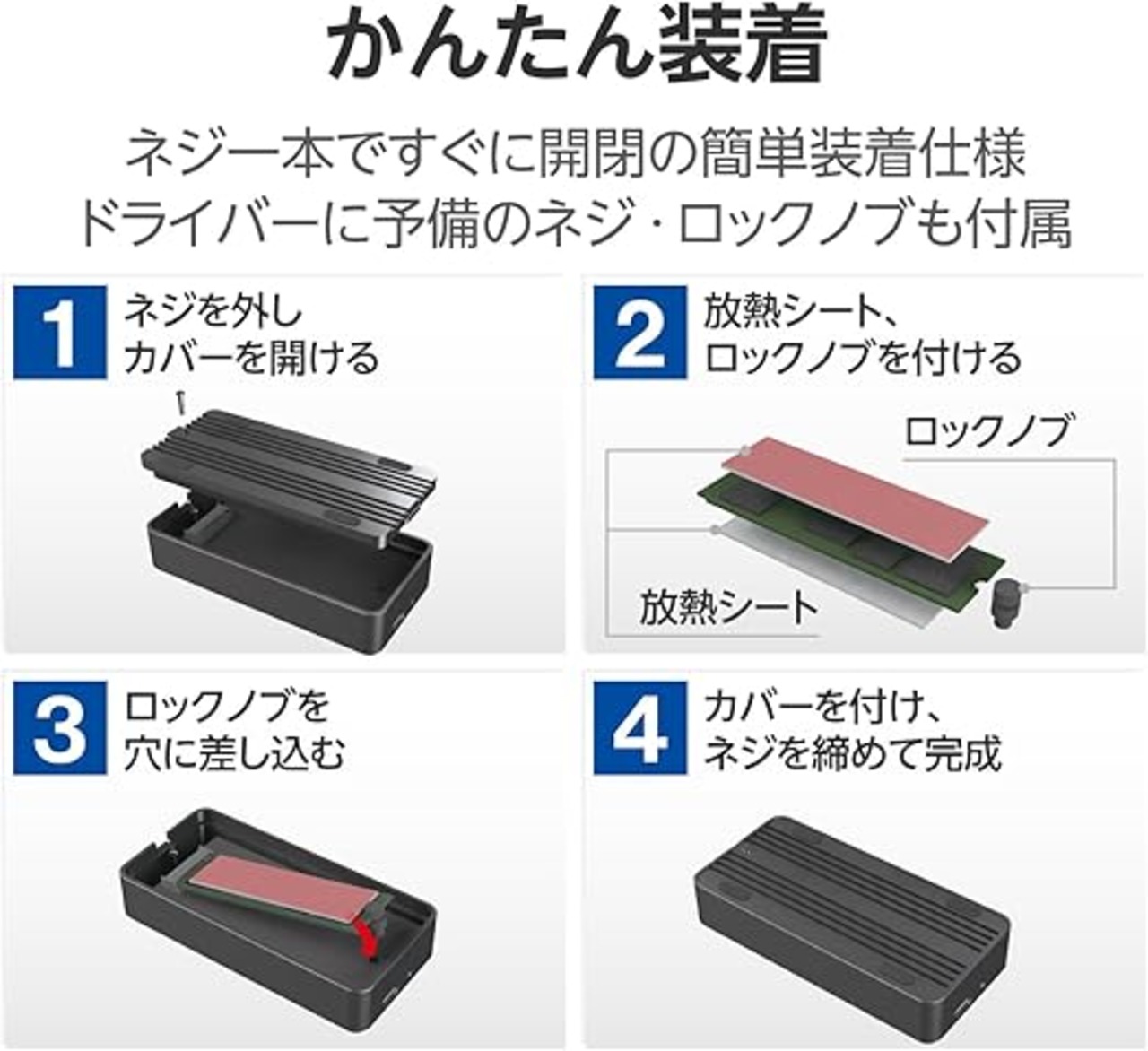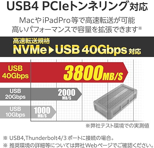USB4対応パソコンへの接続で3800MB/sの超高速データ転送を実現する、NVMe規格のM.2 SSD(最大4TB)に対応したケースです。