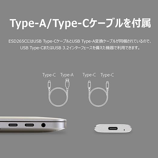 [商品特徴] : 最大1,050MB/sの転送速度を備え、軽くて丈夫なアルミケースを採用。耐衝撃性に優れ重量も僅か31gと手軽に持ち運べます。Windows、macOS、iOS、iPadOS、Androidを含む様々なOSや機器で使用でき、デスクトップやノートPC、タブレット、スマートフォン、ゲーム機に高速データ転送と大容量の拡張を提供します。多用途性が高いので、ストレージ容量を増やすのに便利で効率的なソリューションです。USB Type-CケーブルとUSB Type-C to Type-Aケー
