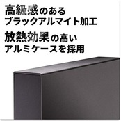 シンプルなデザイン フラットな表面に、ブラックアルマイト加工を施したアルミケース*を使用。タテ・ヨコ両方の置き方やファンレス動作設計により、様々な置き場所にマッチ。