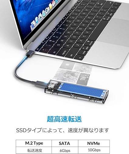 【10Gbps/6Gbps超高速】M.2 SSD 外付けケースは、最新式のマスターチップ採用し、NVMeとSATA仕様のSSDがどちらも対応します。NVMe仕様SSDを搭載時に最大転送速度は10Gb