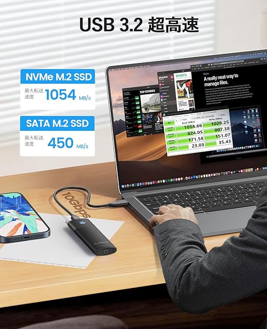 【10Gbps高速M.2 NVME SATA SSD ケース】NVMe SSDを使用する場合、伝送速度は10Gbps、読み書き速度は1000MB/sです。 M.2 SATA SSDを使用する場合、転送速度は5Gbps、読み書き速度は400MB/sです。