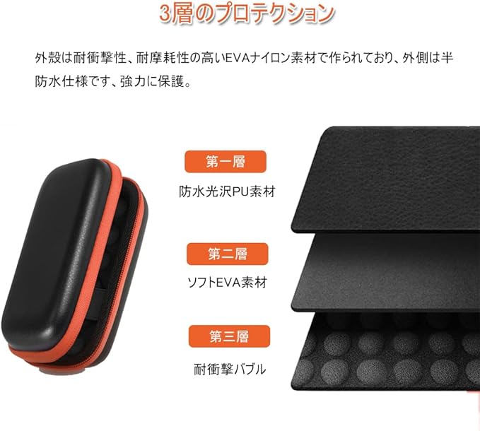 【材質】外殼は耐衝撃性、耐摩耗性の高いEVAナイロン素材で作られており、外側は半防水仕様です。強力に保護し、デバイスの持ち運びや使用を安心して行うことができます。