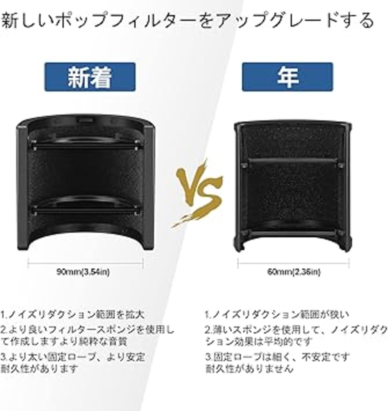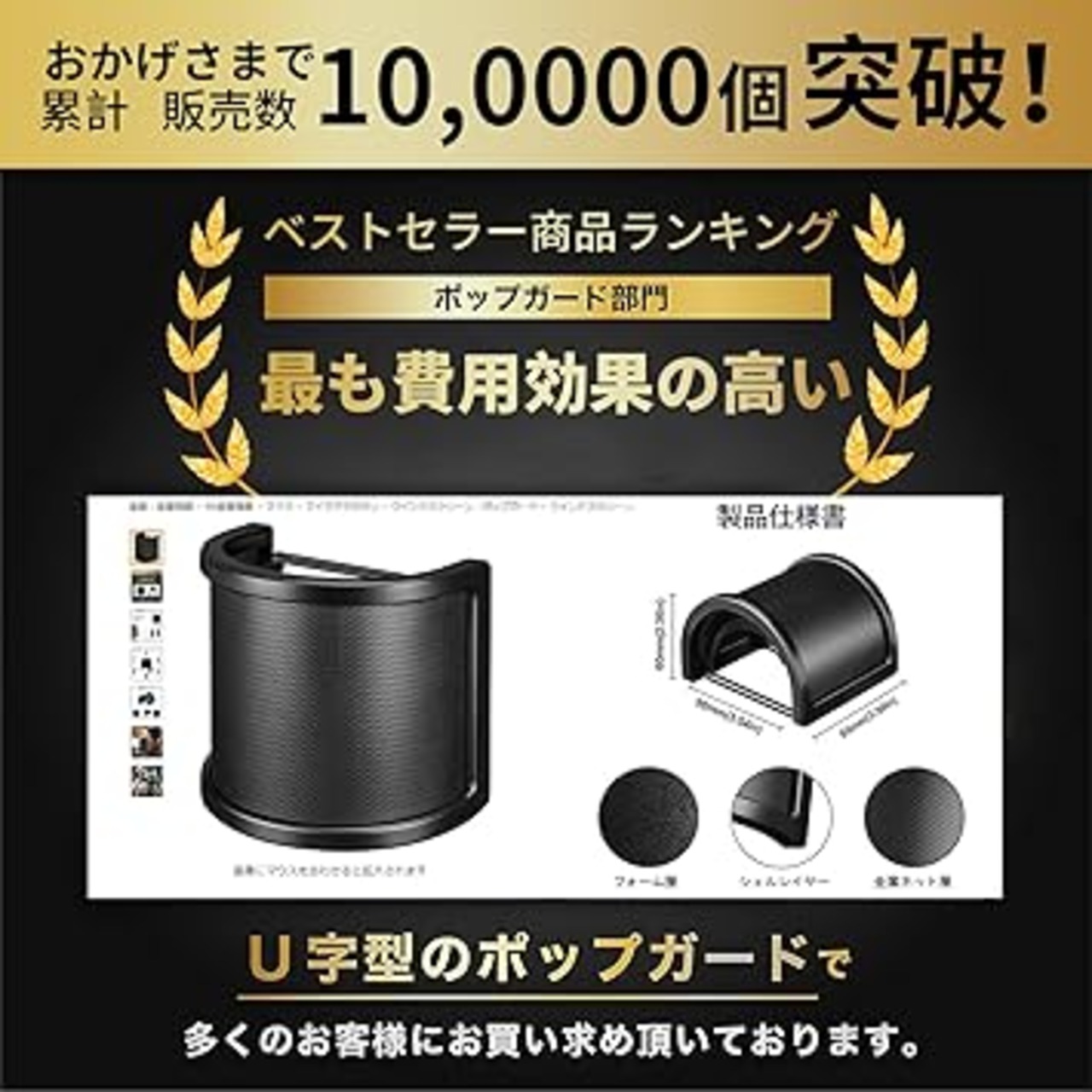 【高いノイズカット性能】既存のU型ポップガードにさらにスポンジ層を搭載したことで、よりノイズカットが可能になりました。従来比で40%もの性能がアップしています。