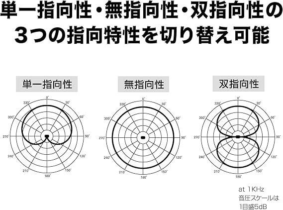 【指向性切り替えスイッチ付】DCバイアス・コンデンサー型ツインダイアフラム搭載で、全指向性と単一指向性、双指向性をスイッチで簡単に選択できます。