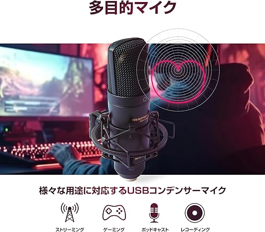 【Mac/PC対応 多目的マイク】ストリーミング、Podcastコンテンツ作成(Garageband/Logic/Adobe Audition/Audacity対応)、Twitch/Skypeでの使用、YouTube動画作成や会議などにも理想的な高品質USBマイク