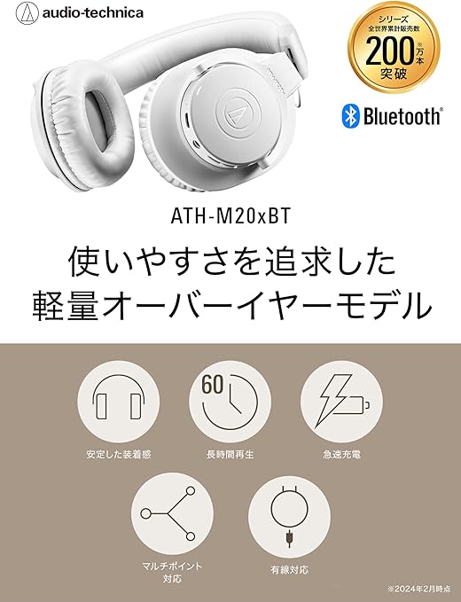 オーディオテクニカ ATH-M20xBT WH ワイヤレスヘッドホン ヘッドホン Bluetooth 有線 ヘッドフォン 40mmCCAWボイスコイルドライバー 216gの軽量ボディ マルチポイント 低遅延モード 最大60時間再生 ハンズフリー通話 ホワイト a | PCBASE