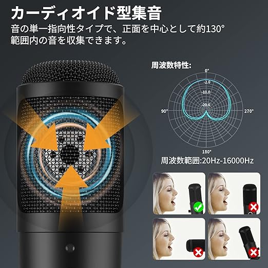 【高音質·単一指向性集音】このUSBマイクはプロなサウンドカードが内蔵して、ノイズキャンセリング技術も搭載し、周りの騒音を効果的に抑えられて、カーディオイド線性集音特性が採用され、単一指向性集音の特徴で真正面からの音声には感度が高く、約130°の範囲で収音して、クリアな音を再現できるPC用コンデンサーマイクです。高集音性で15cm離れてもクリアに集音でき、音声を綺麗で忠実に再現できます。