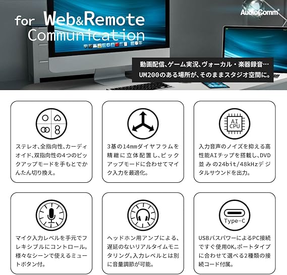 【 特 長 】 ◆スタジオレベルのハイパフォーマンスを実現した高性能USBコンデンサーマイク ◆「ステレオ」「全指向性」「カーディオイド」「双指向性」の4つのピックアップモード搭載。手元でかんたんに切り替えができます。・ ステレオ…ステレオ録音全般、バンド演奏など・ 全指向性…Web会議、座談会など・ カーディオイド…Webキャスト・ヴォーカル、ゲーム実況など・ 双指向性…インタビュー、楽器演奏など ◆3基の高性能14mmダイヤフラムを精緻に立体配置し、ピックアップモードに合わせてマイク入力を最