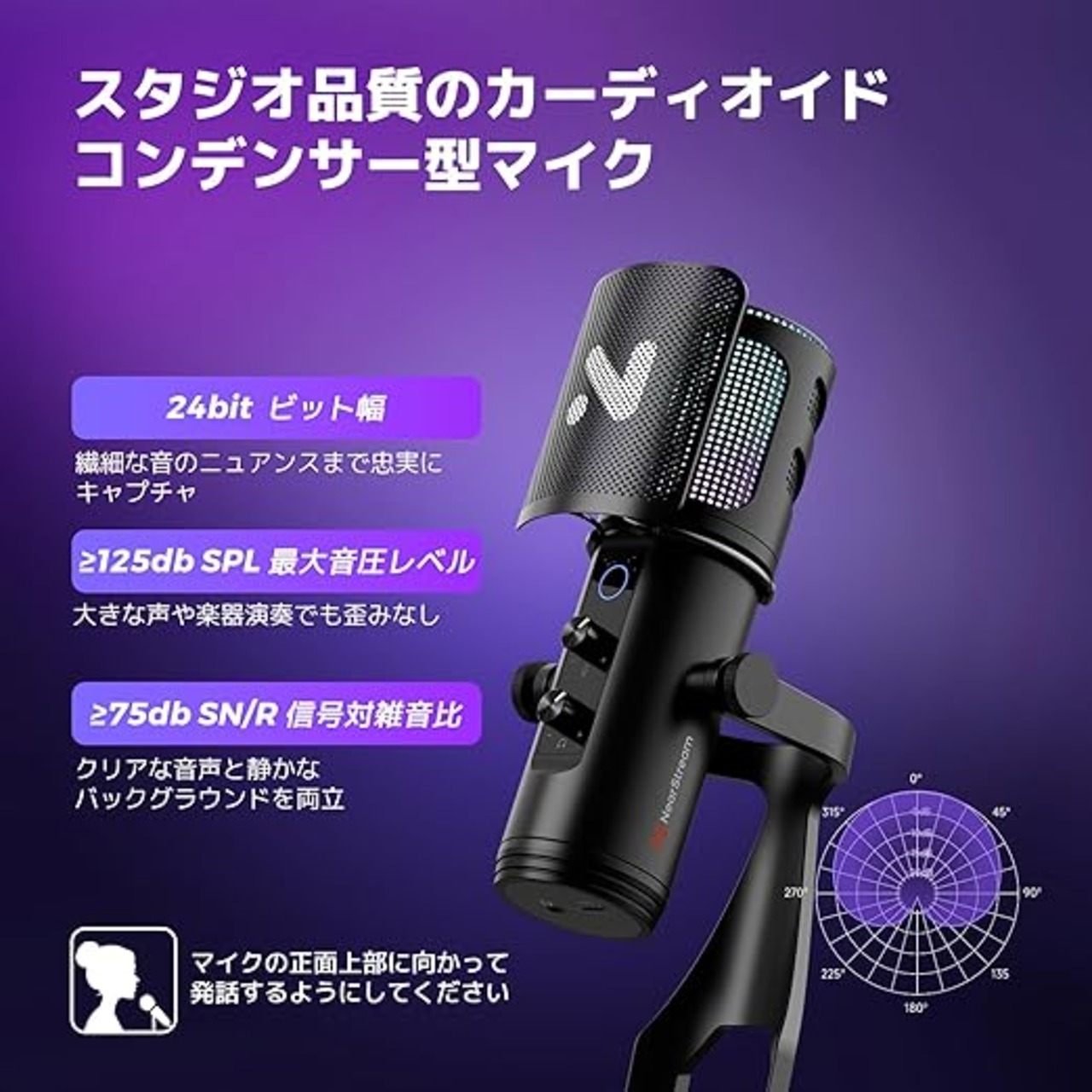 【スタジオ品質の超単一指向性ゲーミングマイク/AIノイズ低減技術/ポップガード付き】 AM35U コンデンサーマイクには、NearStream独自開発のAIノイズキャンセリングチップが搭載されており、ホワイトノイズやキーボードを叩く音などの不快な音を抑制できます。マイクのタッチセンサー部を2回連続でタッチするだけで、ノイズキャンセリング機能を簡単に有効または無効にすることができます。カーディオイド型の単一指向性設計により、マイク正面の音声を集中的に収音し、背景の雑音を最小限に抑え、話者であるあな
