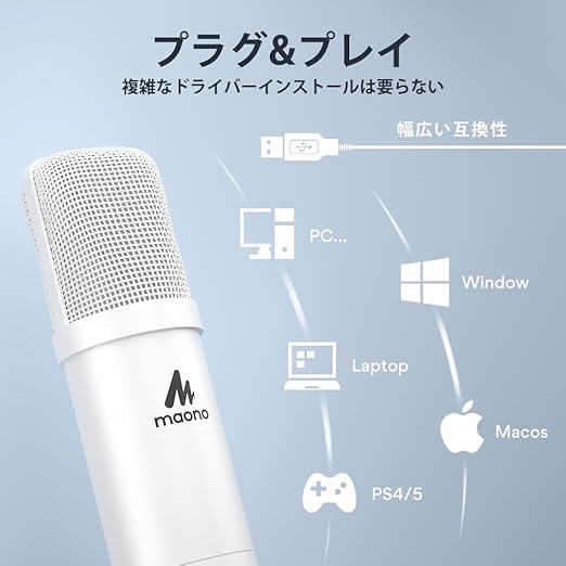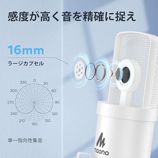 【高音質】サンプリングレートは192kHZ/24bitに達して、原音を忠实的に再現します。カーディオイド型集音の単一指向性タイプで、正面(Mのロゴ側)を中心として約130°範囲内の音を収集できます。発言者の声を集中して拾うとともに周囲の音を抑え、声がクリアに聞こえます。