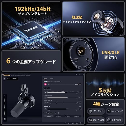 【お手軽セッティングで本格的なマイク音声を堪能!】MAONO PD300XTダイナミックマイクは192kHz/24bitの超高解像度サンプリング(CD音質の4倍)、4種シーンプリセット搭載、頑丈なダイナミックマイク構造と5段階ノイズリダクション技術により、あらゆる音の細部まで鮮明に再現し、本物の音質を保証できます。USB/XLRデュアルインターフェースで、PC・ミキサー・スマホなど多様なデバイスとシームレス接続できます、性能の点では間違いなく優秀です。