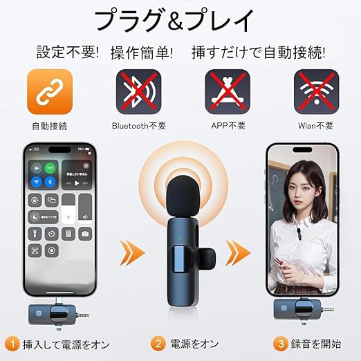【操作簡単】スマートフォンに接続されたデバイスはスマートフォン自身の電源で動作するため、充電は不要です。もちろん、本体右側面にはType-Cの充電端子も搭載しており、接続したままでもスマートフォンの充電が可能です。マイクをデバイスに接続する際に特別なアプリや設定(Bluetoothなど)は必要ありません。マイクの電源を入れるだけで自動的に接続されるの点は、煩わしい操作が不要でとても便利だと思います。ライブ配信やYouTube撮影、Vlogなど、長時間にわたる用途に最適なピンマイク。注意: マイク