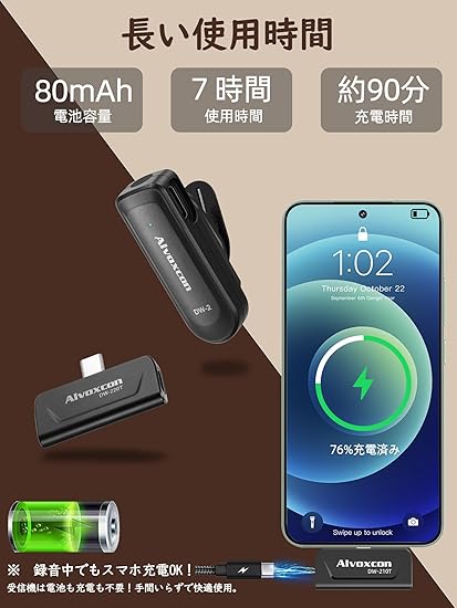 【コンパクト&長時間使用】軽量・小型設計で、持ち運びに便利なワイヤレスマイク。80mAhバッテリー内蔵で、約90分の充電で最大7時間連続使用可能。さらに、受信機の充電ポートからスマホに給電も可能。外出先での撮影も安心です。