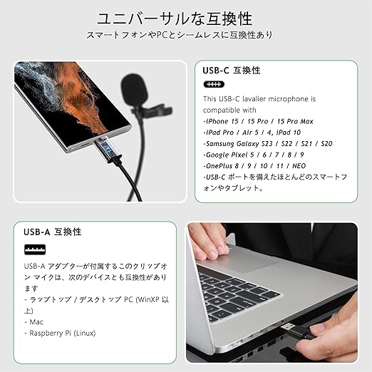 USB-C & USB-A 対応 幅広い互換性 - このラベリアマイクは、iPhone 15/16 シリーズ、Samsung Galaxy S24/23 をはじめ、USB-Cポートを搭載したスマートフォンやタブレットに対応。さらに、USB-C to USB-Aアダプター付き で、ノートPCやデスクトップPC、Macなどのパソコンでも使用可能です。