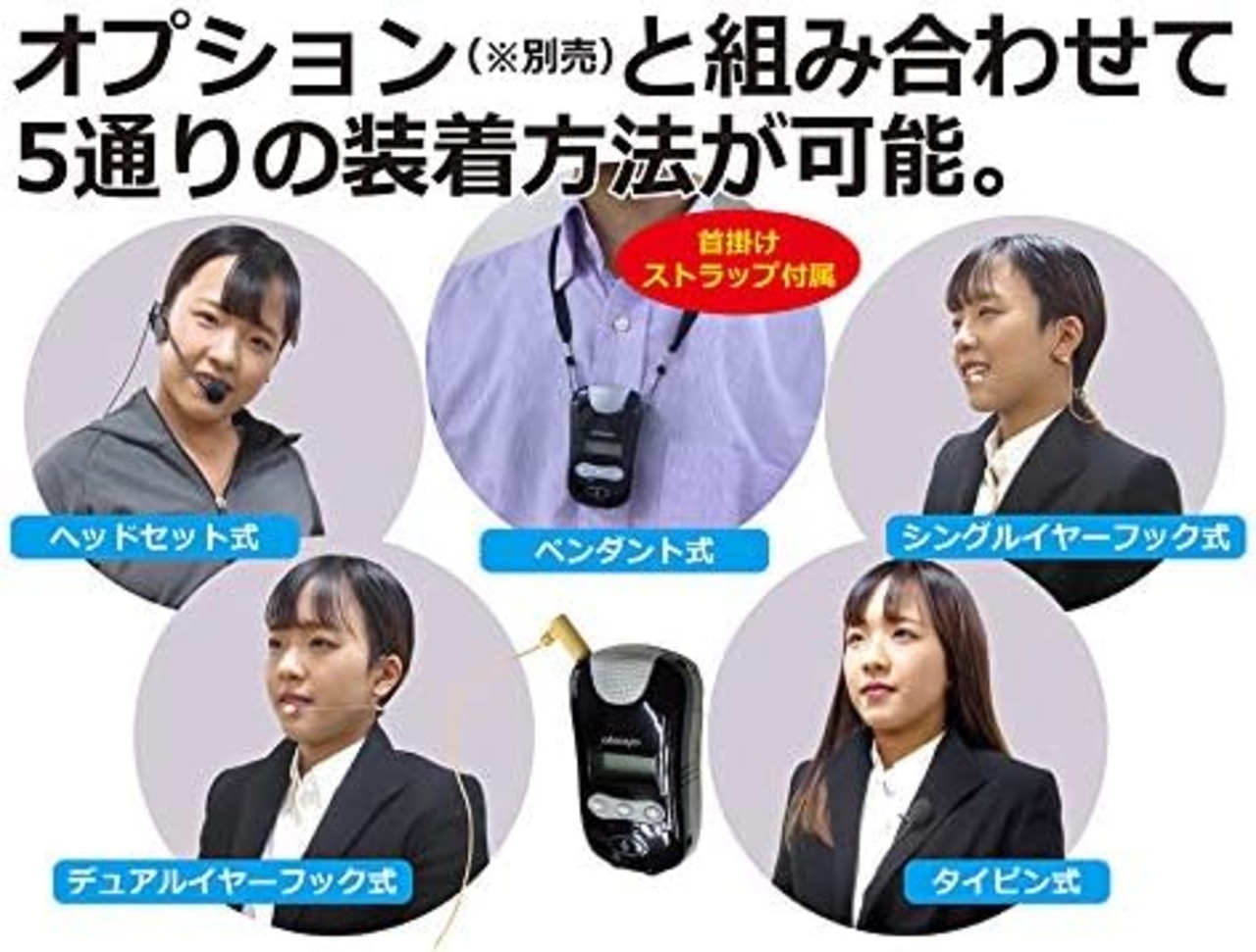 ハンズフリーで使用でき、別売のマイクベルト、タイピンタイプのTM-152JT、イヤーフック型SM-630JT、DM-648JT、ヘッドセットHM-606JT等と合わせれば、動きの多いスピーチなどにも対応できます。