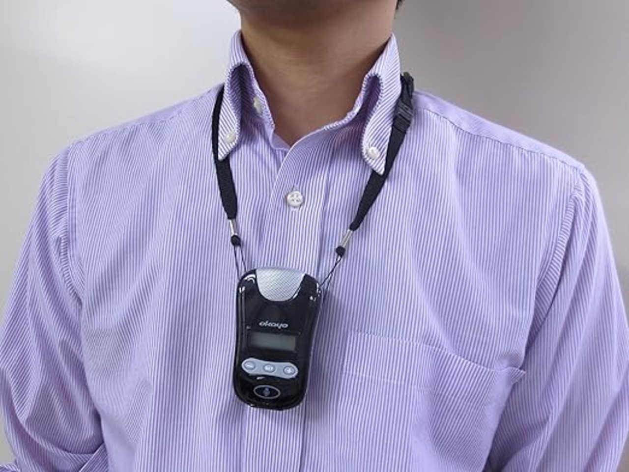 首からかけてハンズフリーで使用できるワイヤレスマイクロホン。